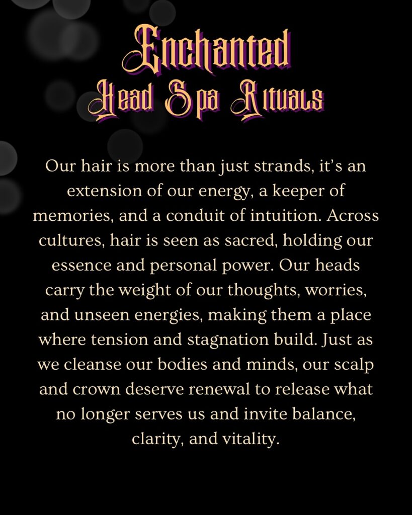This transformative ritual is designed to cleanse, restore, and elevate your mind, body, and spirit. Your journey begins with an herbal smudging and crystal therapy to release stagnant energy and set sacred intentions. A detailed scalp and hair analysis follows, preparing you for a custom scalp and hair treatment paired with a deeply relaxing scalp massage.